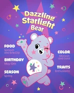 Dazzling Starlight Bear is a Care Bear who was first released during the Squishmallows x Care Bears collab in July 2025 with the name Dazzling Star Bear. Her current name would not be known until her post on the Care Bears Instagram in September 2025.