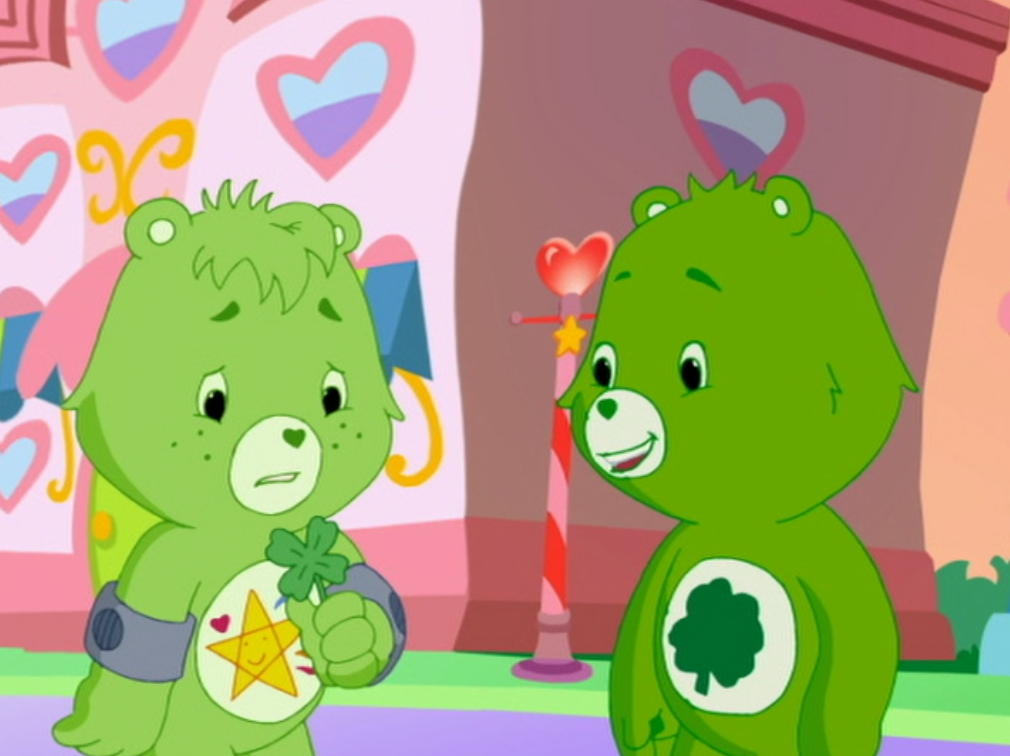 Oopsy runs into Good Luck Bear while in Smart Heart Library and gets an idea. He runs off and finds a four leaf clover. He puts the clover in his helmet and gets back to work practicing for the big race tomorrow.