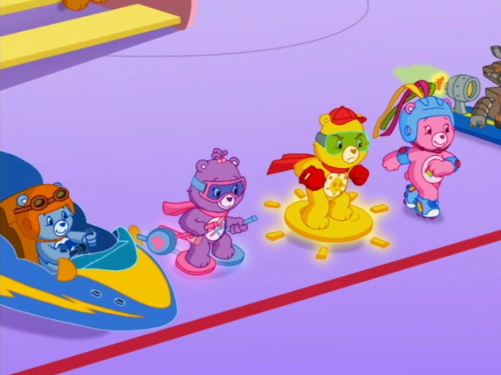 Tomorrow is the big Care-a-Lot race. Cheer shows off her rainbow roller-skates that she's going to use in the race. Funshine will be flying on a sun disk created by his belly badge, and Share will be skiing with lollipop skis created by her belly badge. Grumpy reveals his invention: A super fast cloud car called Stormy. Oopsy flies by on his hover board with Wingnut dangling off the end. The other bears notice how fast Oopsy is before he crashes into the Gathering Tree.